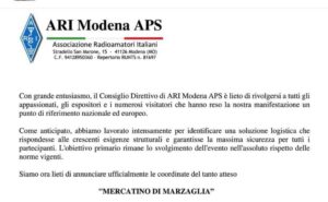 - E c’è di nuovo il Mercatino…Finalmente, Good News! E’ durata un bel po’ di tempo l’assenza dello storico Mercatino di Marzaglia finora racchiuso nella gabbia dei nostri desideri. Prima il Lockdown imposto dal Covid, poi le difficoltà che l’ARI di Modena ha dovuto affrontare nella...