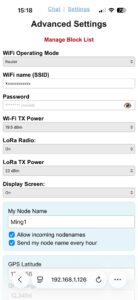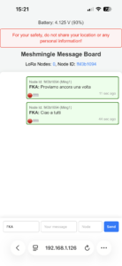 Quindi: niente Bluetooth nella sua gestione, che si effettua esclusivamente via Wi-Fi sia utilizzando la schedina Lora come hotspot (ad esempio se in /P col proprio smartphone connesso al suo Name ID (di default meshmingle.co.uk) sia allacciando la stessa alla propria rete LAN Wi-Fi di casa (e in questo caso l’indirizzo IP è mostrato sul display della scheda). La rete Mesh si svilupperà ovviamente in RF via Lora.